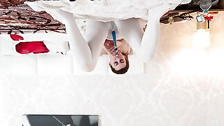 10:27Sexy thick boobs white pantyhose plays with dildo and he caught and put the dick on her jaws
